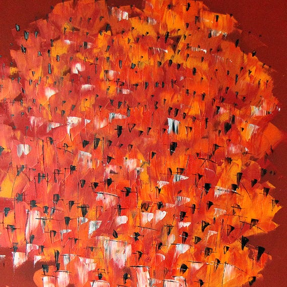 Arnold Kumordzie, born in Ghana, tells stories from his homeland using warm colors.