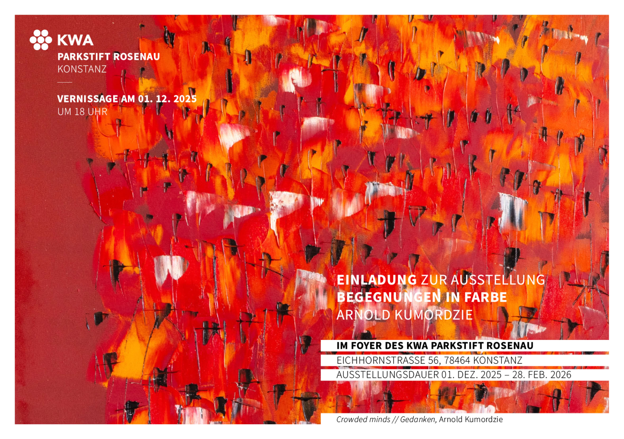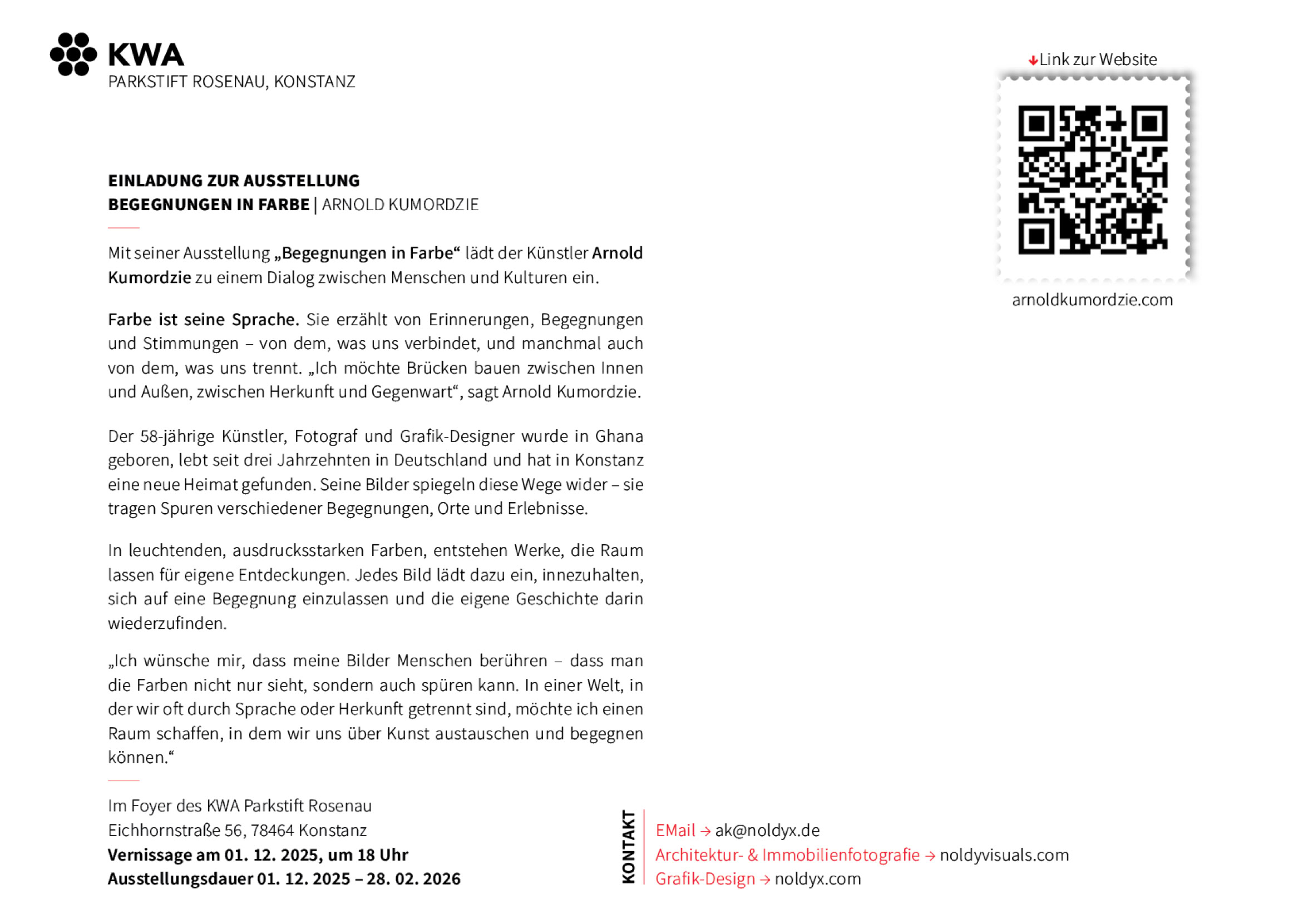 Farbe ist seine Sprache. Sie erzählt von Erinnerungen, Begegnungen und Stimmungen – von dem, was uns verbindet, und manchmal auch von dem, was uns trennt. „Ich möchte Brücken bauen zwischen Innen und Außen, zwischen Herkunft und Gegenwart“, sagt Arnold Kumordzie.